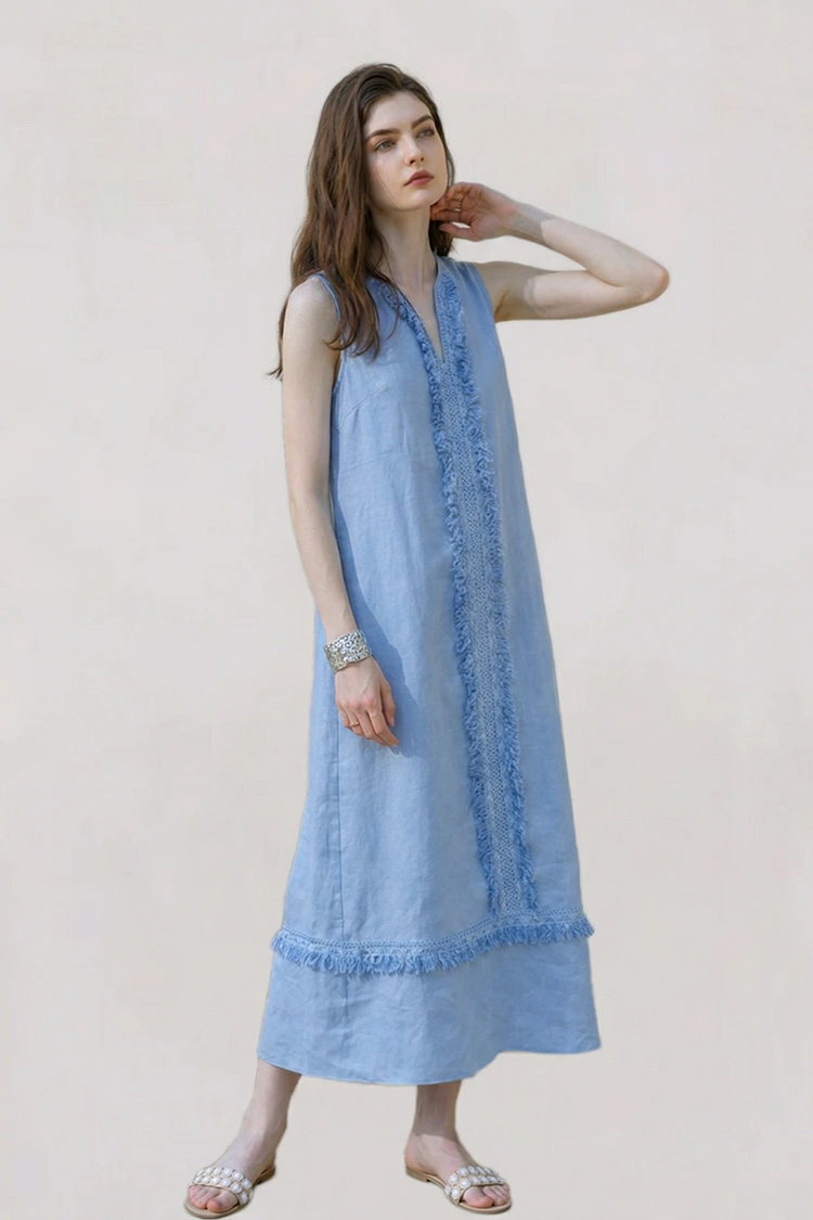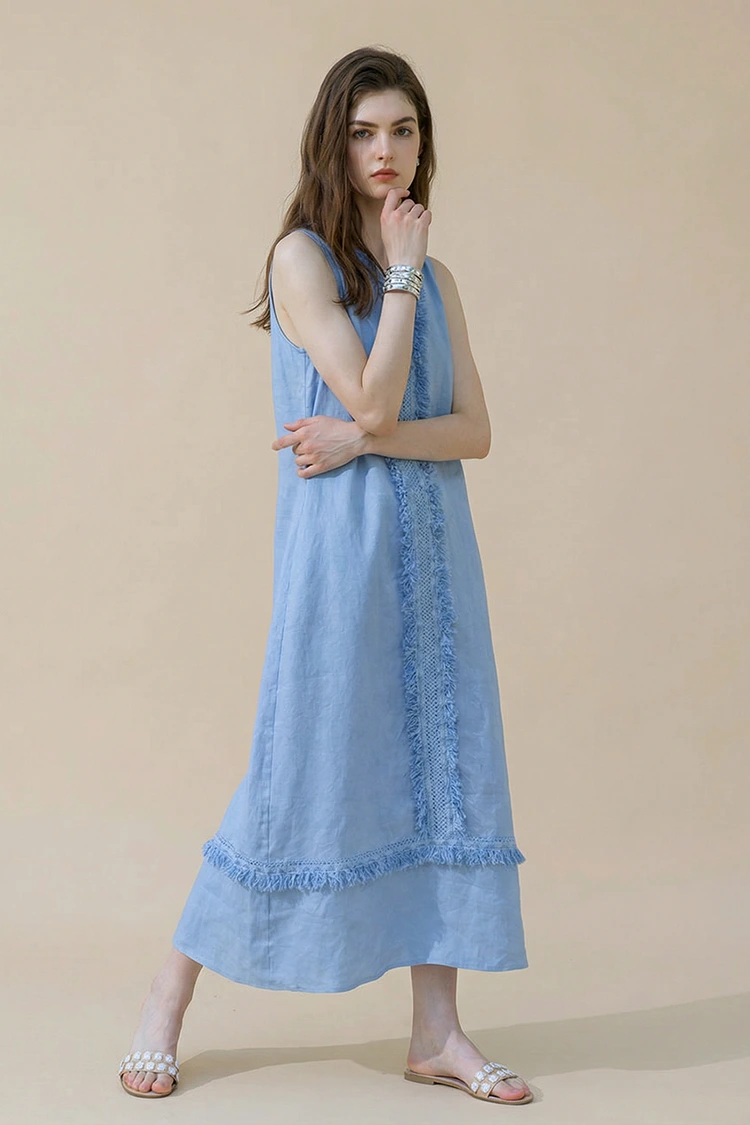 Стильное женское льняное платье-макси отличается детальным дизайном, нарушая монотонность льняных платьев-макси и подчеркивая моду и текстуру. Такой дизайн помогает покупателю выделиться среди аналогичных товаров. В дизайне основное внимание уделяется изысканному кружевному лоскутному шитью с бахромой и V-образному вырезу с нежной кружевной текстурой. Насыщенная текстура перекликается с тем же кружевом на подоле, добавляя богатые визуальные слои к простому однотонному узору. Он не выглядит громоздким и не добавляет романтической атмосферы, гармонируя с нежными тонами лета. Дизайн в чистых цветах является классическим и долговечным, не ограничиваясь каким-либо стилем одежды. Он также поддерживает настройку цвета, отвечая позиционированию бренда и требованиям рынка различных покупателей. Швы на деталях аккуратные и тонкие, без лишних ниток, а кружевное лоскутное одеяло прочное и вряд ли отвалится, что демонстрирует строгие стандарты контроля качества RUIFAN, что еще больше повышает конкурентоспособность продукта на рынке.