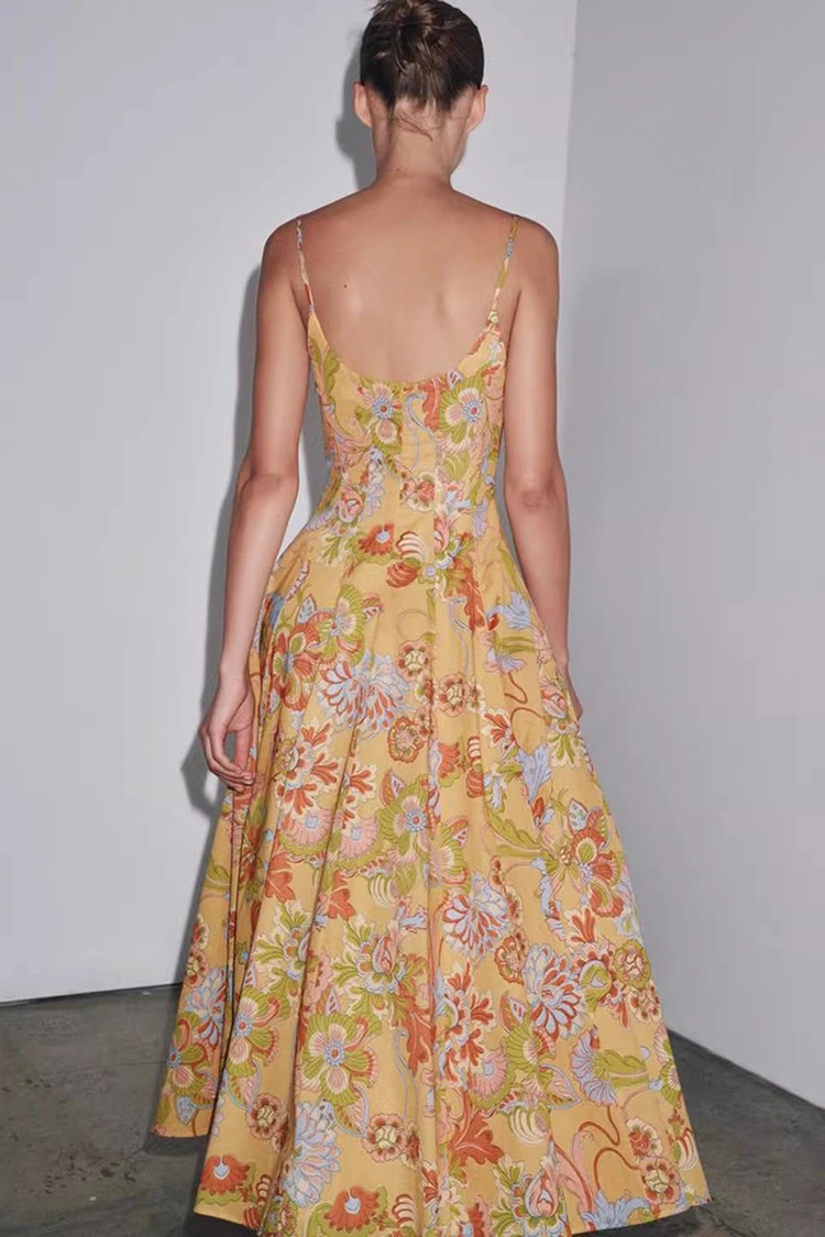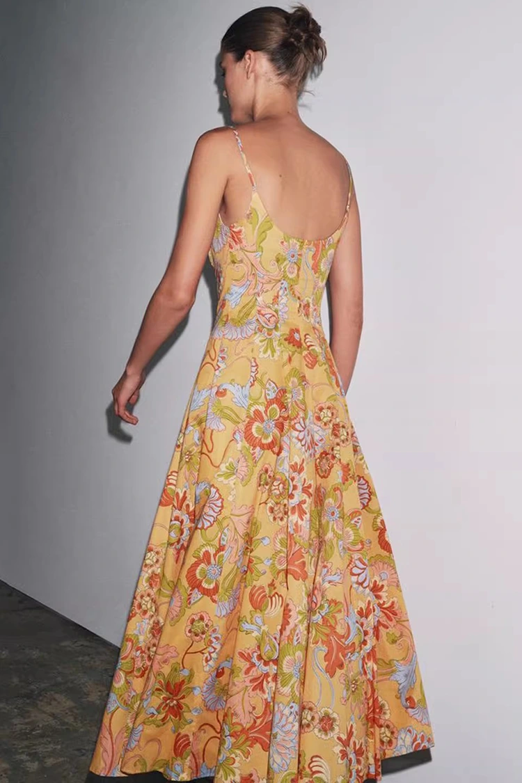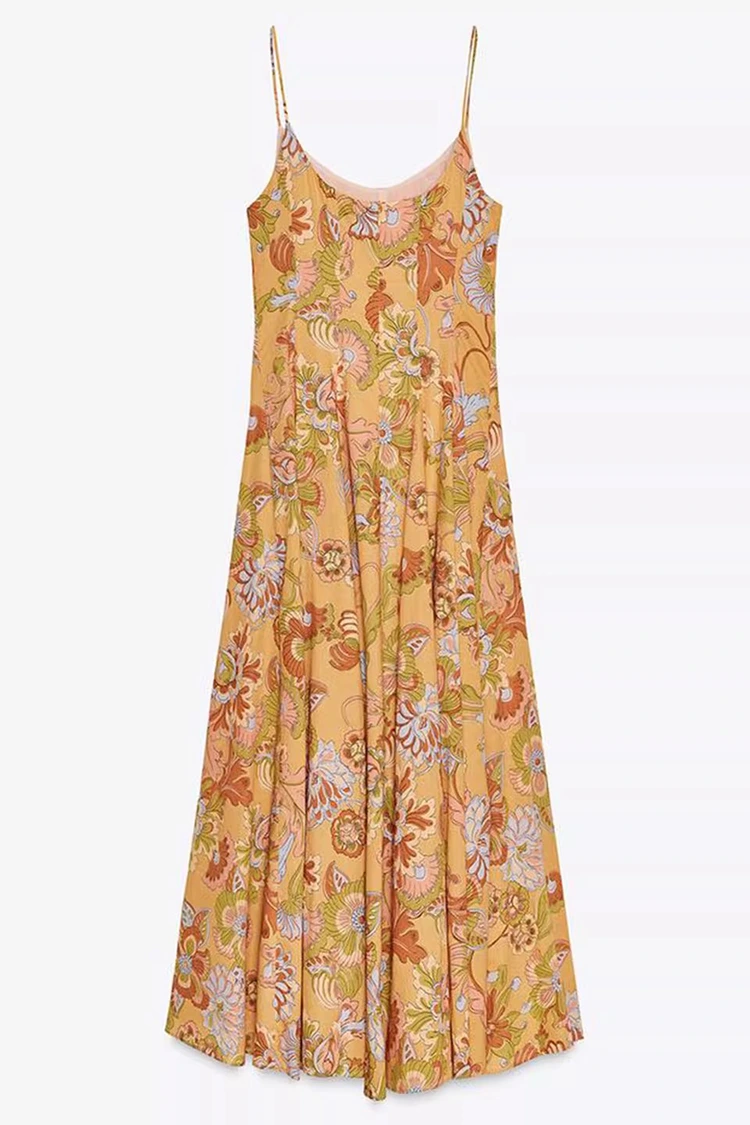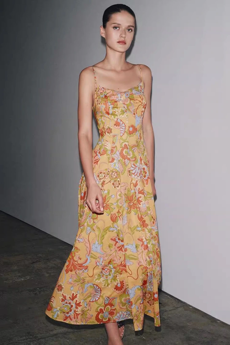 Женское хлопковое летнее платье с цветочным принтом имеет светло-оранжевый базовый цвет и богато текстурированные цветочные принты, покрывающие всю поверхность. Теплые и мягкие тона приносят жизненную силу, словно на теле носится целый цветущий летний сад. Он сочетает в себе ретро-романтическую атмосферу с летней непринужденной атмосферой. Силуэт отличается дизайном без рукавов и свисающим воротником, с чистыми и освежающими линиями, которые могут умело раскрыть линии плеч и шеи, пропорционально сформировать фигуру и в то же время освободиться от ограничений коротких рукавов, удовлетворяя потребности в одежде жаркого лета. Подол юбки свободный и умеренный, не привередлив к фигуре, легко скроет мелкие недостатки талии, живота и ног, очень удобен для женщин любого телосложения. Идеальное сочетание ретро-принта и лаконичного силуэта позволяет этому платью не только продемонстрировать женское очарование женщины, но и сохранить повседневный и непринужденный стиль, преодолевая ограничения одного наряда и адаптируясь к различным стилям для творчества.