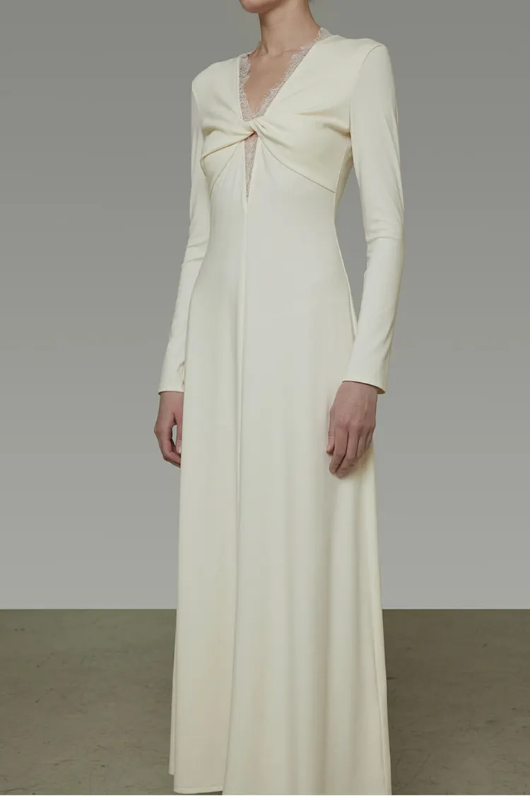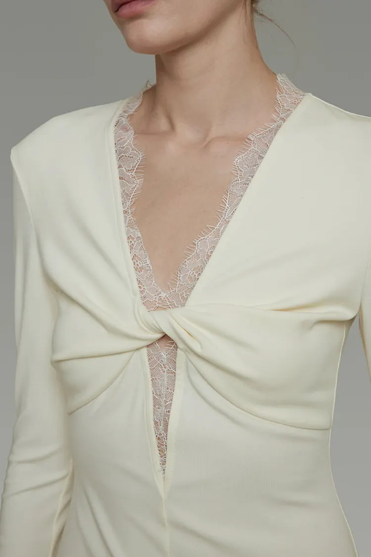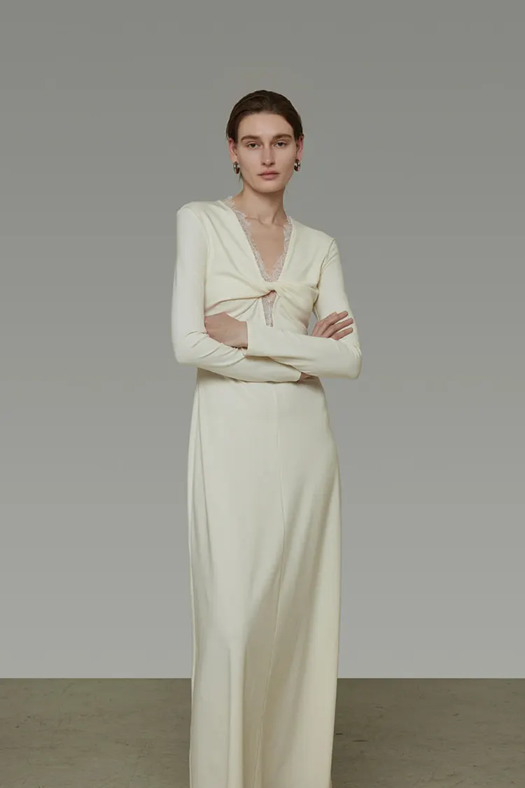 Кружево на V-образном вырезе тщательно закреплено вручную аккуратной строчкой, органично вписываясь в силуэт платья.