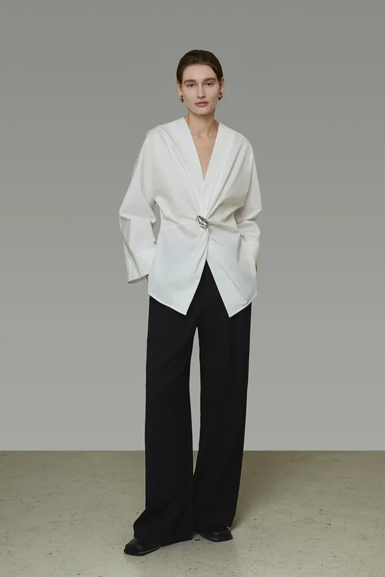 Женская вечерняя блузка с металлической пряжкой имеет асимметричный узел на талии в сочетании с объемными металлическими пуговицами для украшения. Визуальный фокус заметен, естественным образом подчеркивает линию талии и подчеркивает изгибы. Он также использует складки, чтобы смягчить фигуру, обеспечивая высокую степень гибкости для различных типов телосложения. Перекрещенный V-образный вырез аккуратный и элегантный, из четкой и гладкой ткани, легкой и не мнущейся. Он сочетает в себе практичность рубашки для повседневного ношения с модной привлекательностью топа для вечеринок, обеспечивая универсальность ношения и яркую визуальную узнаваемость.