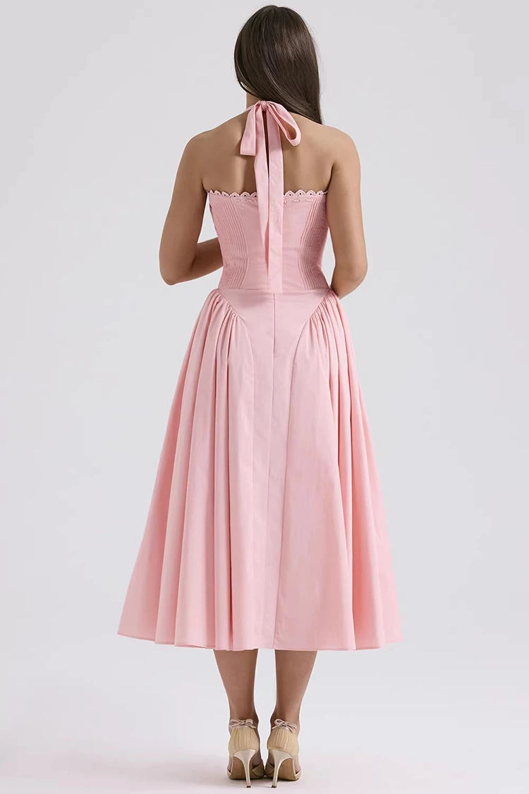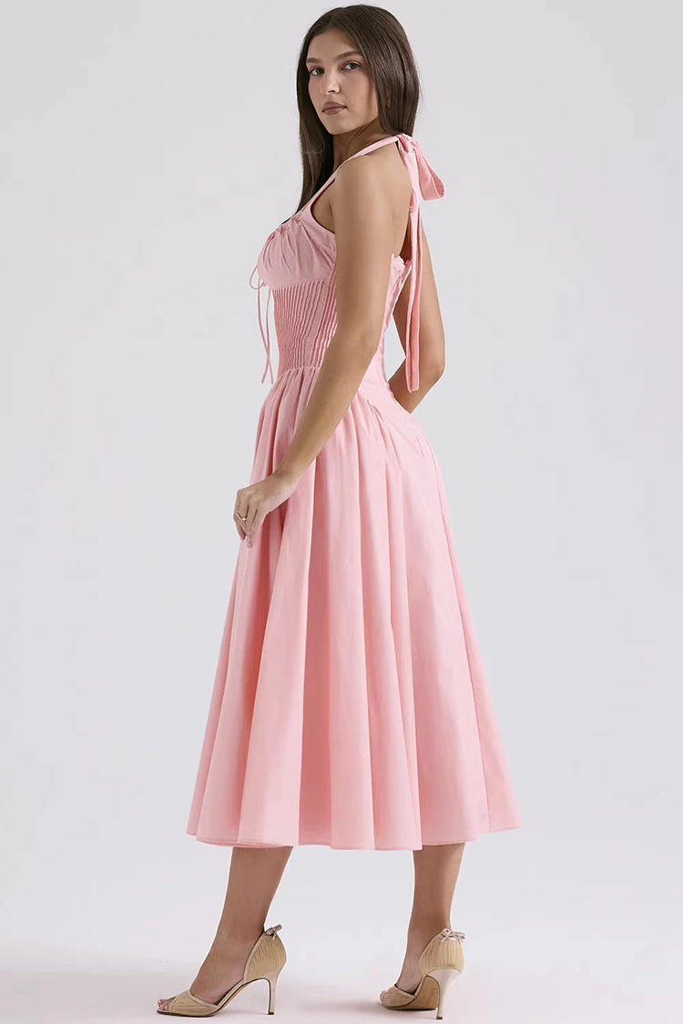 Это женское розовое хлопковое платье-миди нежного и мечтательного персиково-розового цвета с мягким оттенком, не вызывающим раздражения кожи. Он может эффективно осветлить цвет лица и создать романтическую и юношескую атмосферу. В то же время он сочетает в себе ретро-элегантность и элементы современной моды. Галстук на вырезе можно свободно регулировать, затягивая или ослабляя, что позволяет умело очертить нежные линии плеч и шеи, создавая полную атмосферу. Дизайн талии в виде рыбьей кости в верхней части хорошо прилегает к телу, без ощущения резкого сдавливания. Он может слегка стройнить фигуру, подчеркивая изгибы талии и живота. Складки с обеих сторон могут скрыть небольшой жир на талии и животе, что делает его очень подходящим для разных типов телосложения. Модель средней длины в сочетании с дизайном без рукавов обеспечивает плавную, легкую и маневренную линию при ходьбе. Собственная жесткость ткани обеспечивает хорошую поддержку конструкции «рыбий кости», предотвращая ее размягчение или деформацию, а также балансируя красоту и комфорт.